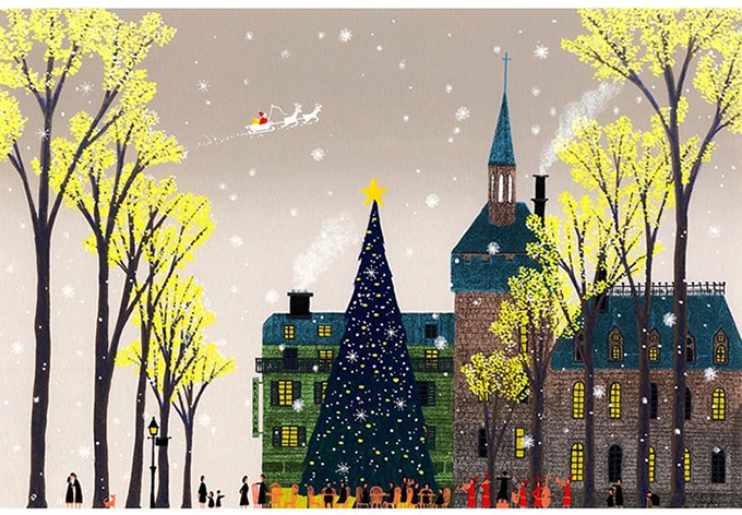 クリスマスで賑わう街並みに、トナカイに導かれたサンタが夜空を舞う幻想的なシーンが印象的な作品です。