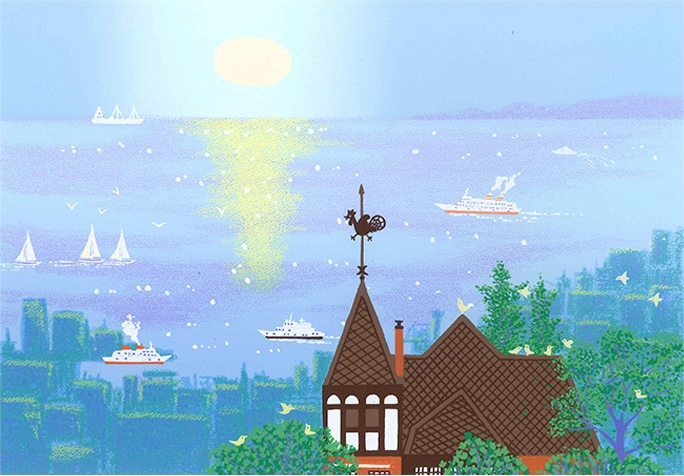 洋風の建物の屋根に立つ風見鶏が象徴的に描かれ、背景には輝く海と行き交う船が広がります。