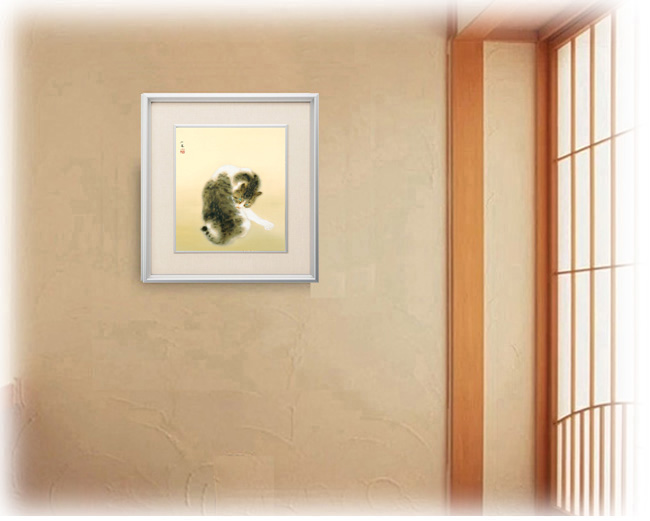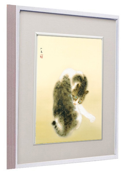 猫の毛並みの柔らかさや動きが巧みに表現され、洋画の技法を取り入れた陰影や立体感が特徴です。