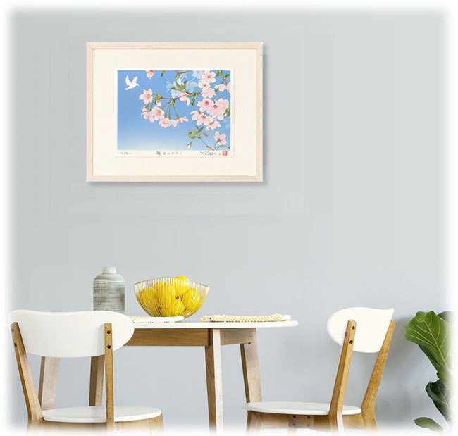 白木地の自然な風合いが作品に調和し、全体として穏やかで洗練された雰囲気を演出します。