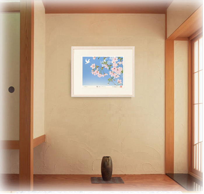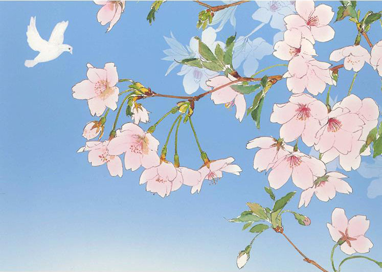 舞い飛ぶ白い鳥が画面に奥行きと希望を添え、春の息吹と心の安らぎを